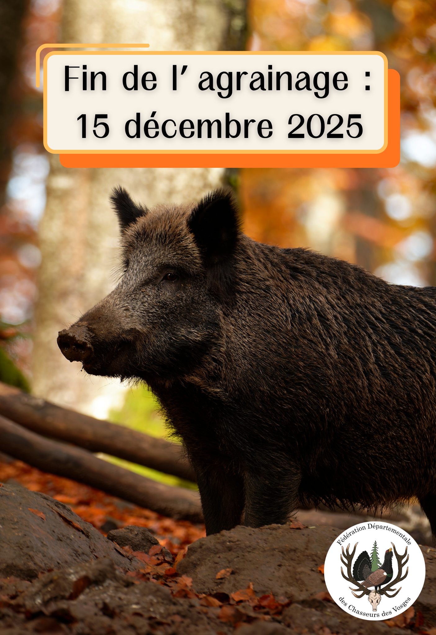 Association agréée au titre de la protection de la natureAttention les modalités réglementaires concernant la chasse de certaines espèces vont évoluer d'ici quelques jours (suivre l'actualité) Pour rappel, La chasse de l’alouette des champs et du vanneau huppé est interdite sur notre département. Informations sur les voies ferrées, Restons Vigilants !ACTU DU MOIS![]() La Fédération sera fermée au public : - À partir de 16h le 24/12 jusqu'au lundi 29/12 - À partir de 16h le 31/12 jusqu'au lundi 05/01/2026 Le conseil d'administration et le personnel de la FDCV88, vous souhaitent de joyeuses fêtes de fin d'année ! Date de fin d’agrainage dissuasif pour 2025 : La formation Spécialisée Dégâts de Gibier de la CDCFS qui fixe les dates limites d’enlèvement des différentes récoltes, a été consultée mi-novembre pour étudier les barèmes céréales et pour fixer ces dates limites concernant toutes les cultures pour 2025. La date extrême a été fixée au 15 décembre 2025 pour six cultures, dont le maïs ensilage et le grain. C’est donc cette date qui fait foi pour l’arrêt de l’agrainage cette saison. Le dernier jour d’agrainage pour le département des Vosges, conformément au SDGC, sera donc le lundi 15 décembre 2025 (inclus). Cette date s’applique donc pour tous les contrats validés pour cette année. Pour l’ensemble des contrats validés, la reprise de l’agrainage pourra s’effectuer qu’à partir du 15 mars 2026, comme prévu par le SDGC. Les jours d’agrainage étant uniquement les lundis et jeudis, le premier jour d’agrainage sera donc le lundi 16 mars 2026. Nous vous rappelons :